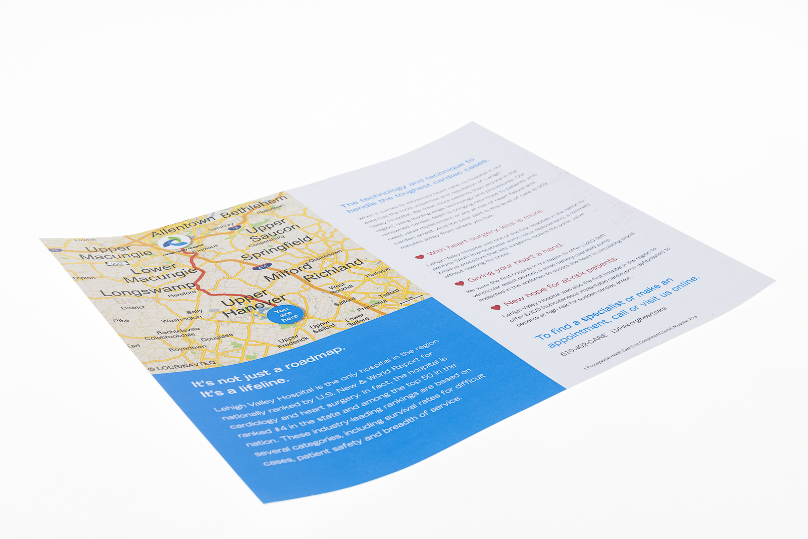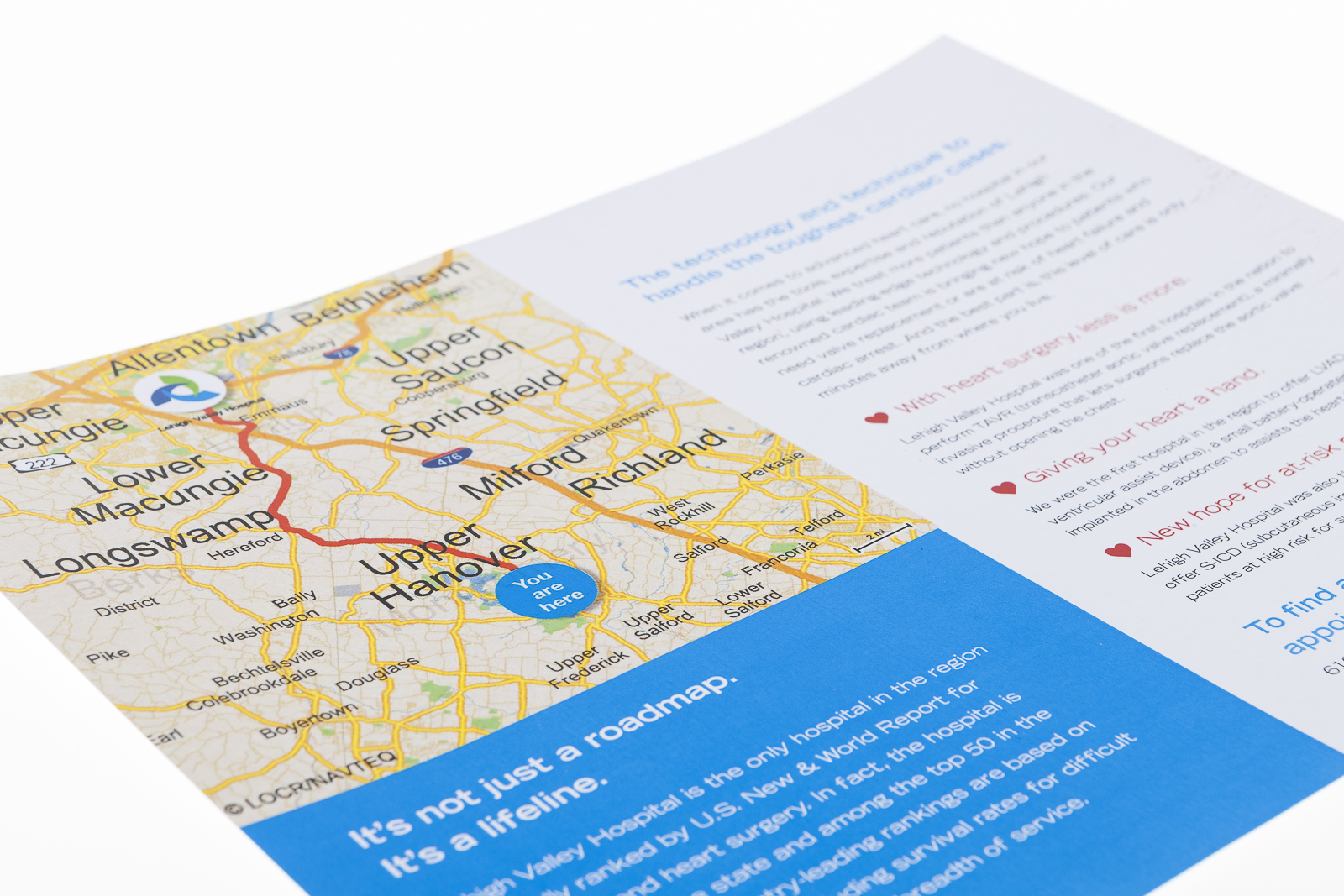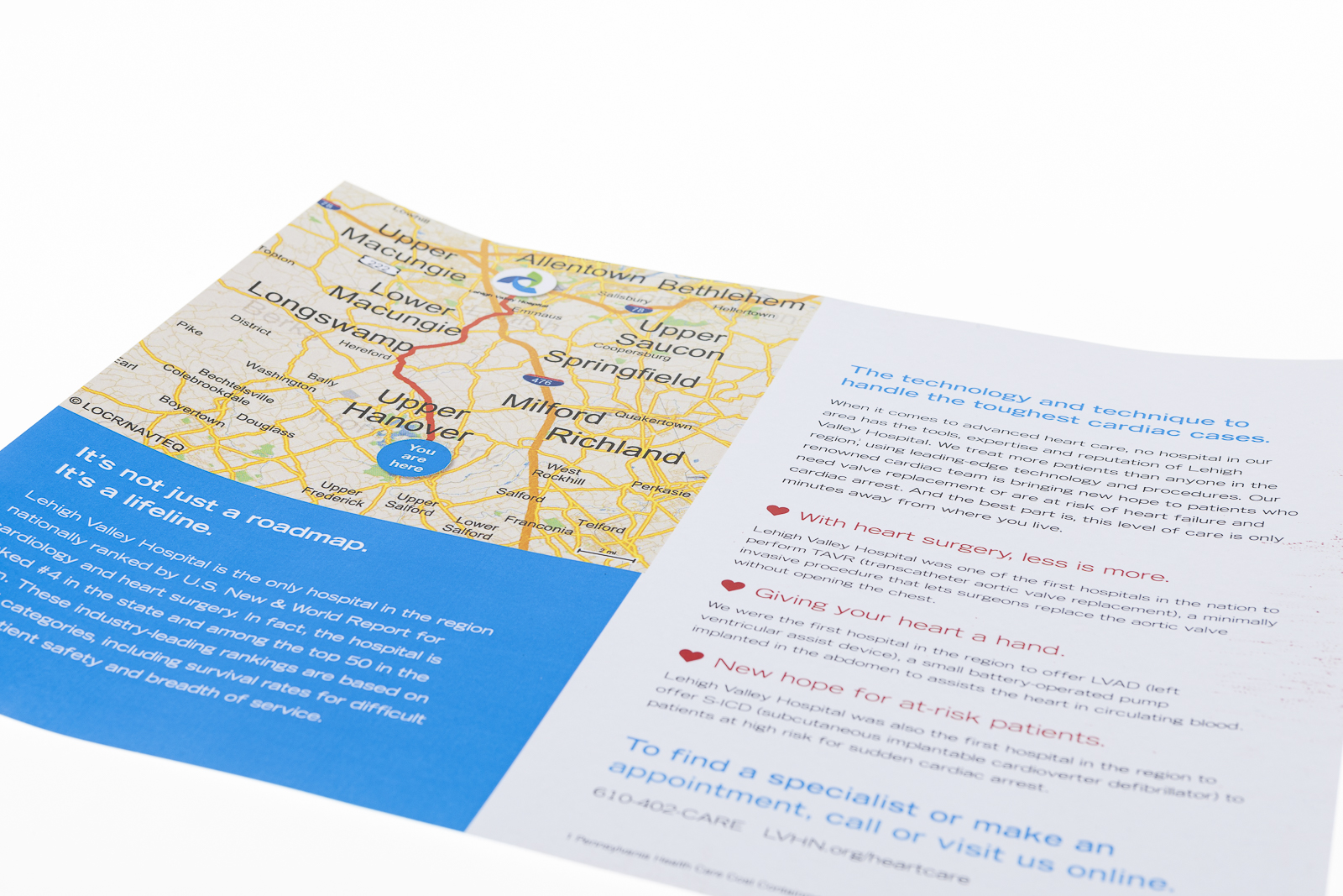 The Lehigh Valley Health Network used personalized NAVImaps by locr in a direct mail campaign to promote the Lehigh Valley Hospital and especially its Cardiology department. The map shows the route the recipient would have to take from their home to the Lehigh Valley Hospital.